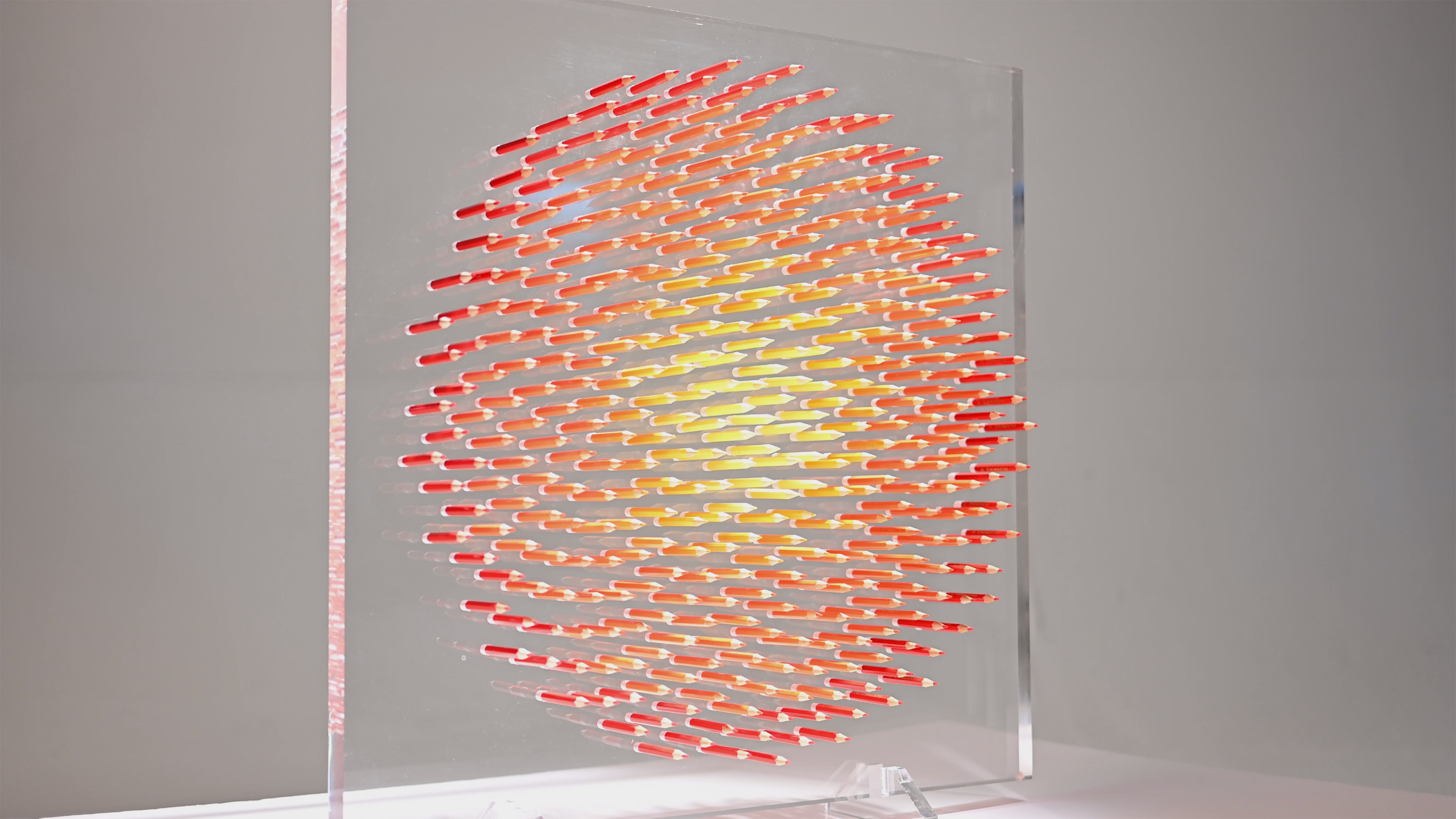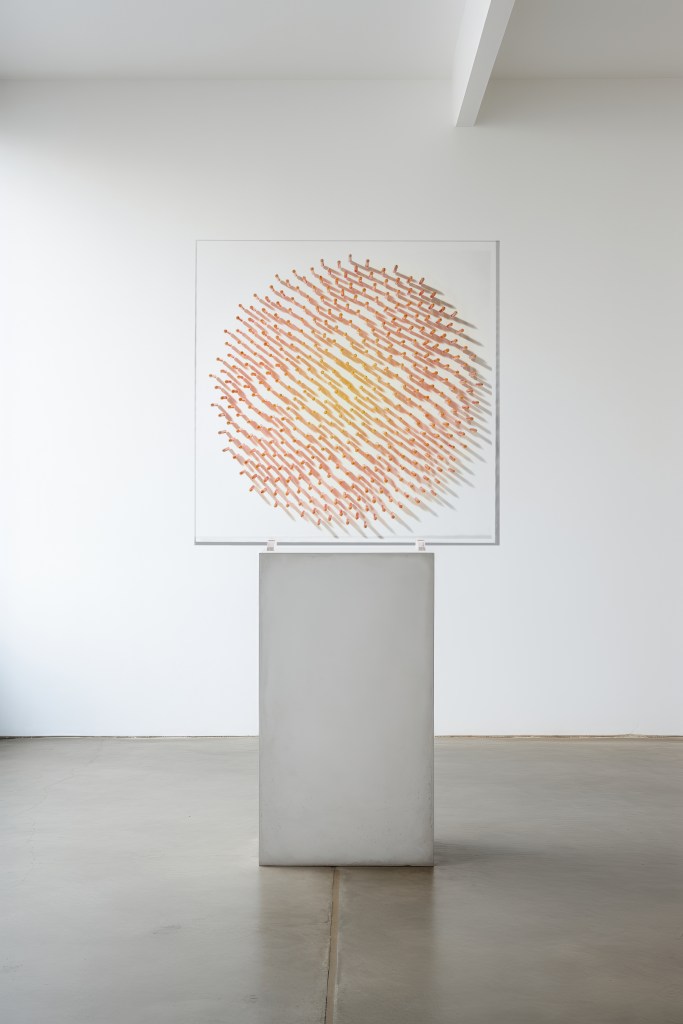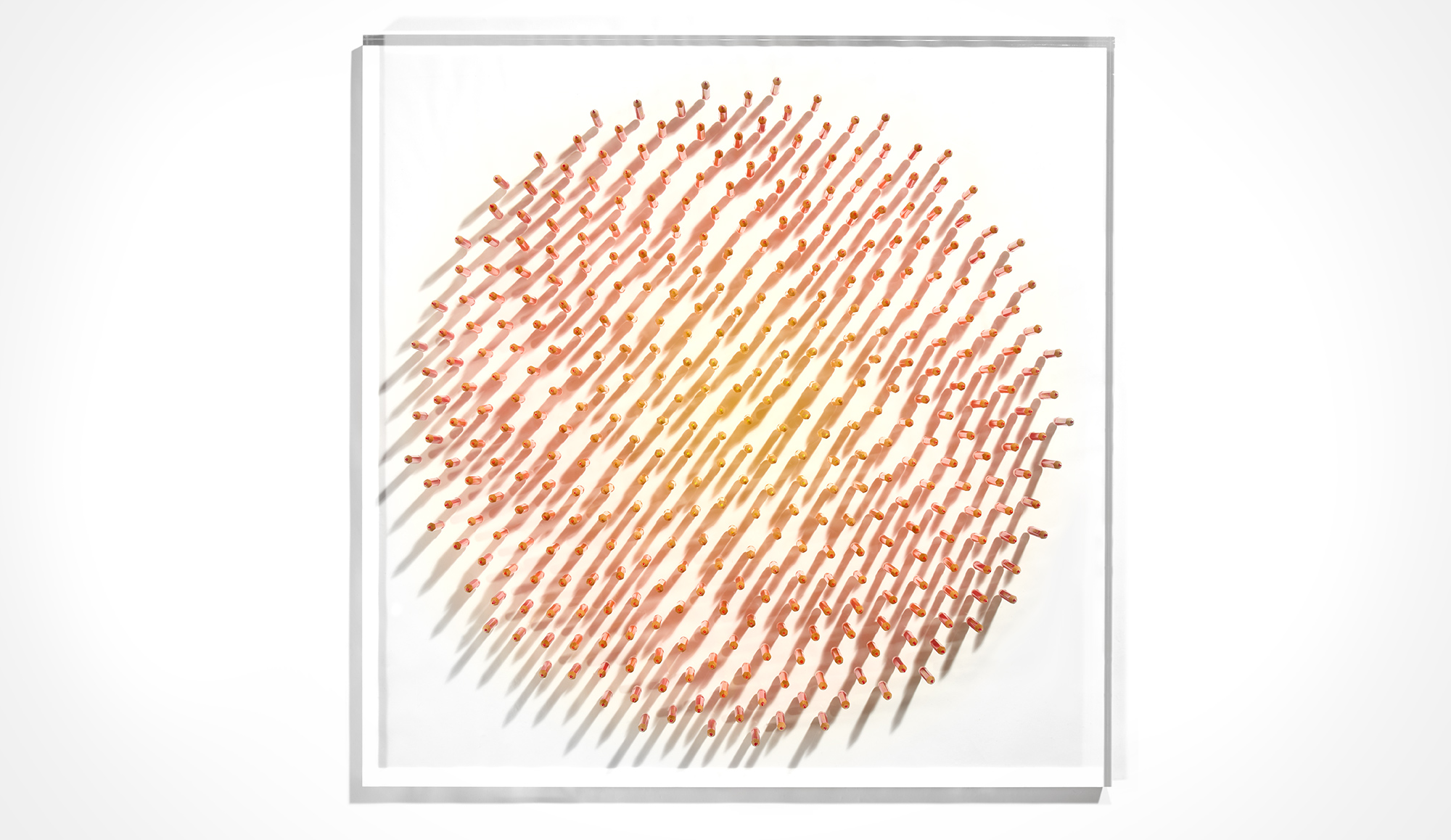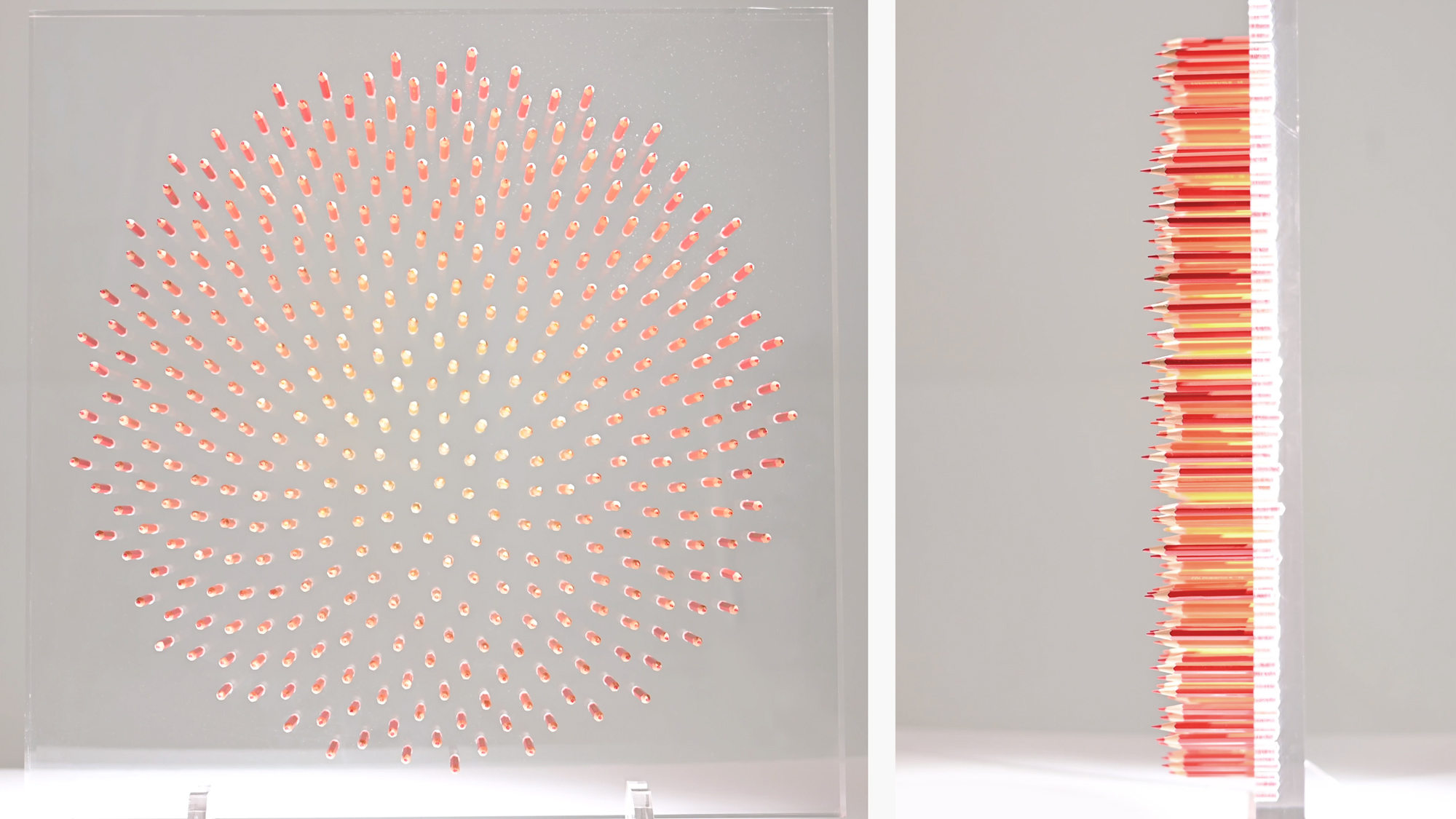 Pencils are tools of art and writing, they extend from the natural world. ‘Pure’ conveys a dense flower head, where each seed is symbolised by a pencil. In this way, the tools we use to document nature become the medium for revealing the rules that shape life, bridging our understanding of nature’s design. I work in the space between rule and result. Nature provides the device; I create conditions, revealing precision through blind repetition. In a world obsessed with control and monitoring, there’s something necessary about this – order finding its own way without control.
